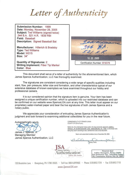 This is a Louisville Slugger Stat Inscribed Baseball Bat that has been Personally Signed & Autographed by Ted Williams of the Boston Red Sox. This item is 100% Authentic to include a Certificate of Authenticity (COA) / hologram by JSA #B19376. We offers a 100% Lifetime Guarantee on all Autographed & Signed Ted Williams memorabilia.