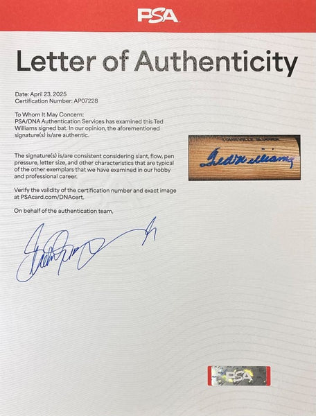 Featured is a Ted Williams signed Louisville Slugger baseball bat. This bat has been hand signed by Williams and comes with the PSA/DNA hologram and letter of authenticity. This bat would make a great addition to any sports memorabilia collection!. SPECIFICATIONS Autographed By: Team: Boston Red Sox Sport: Baseball Authentication: PSA/DNA Authentication Services