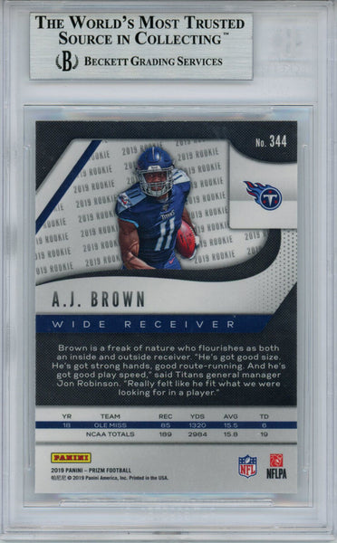 AJ Brown Autographed 2019 Panini Prizm #344 Rookie Card Beckett Slab 35036 The number in the listing title is just an inventory sku for our records and is not the authentication number. The item pictured is a stock photo unless otherwise noted. This is a 2019 Panini Prizm #344 trading card that was personally autographed by AJ Brown. This has been professionaly slabbed by Beckett Authentication Services (BAS) and includes a certificate of authenticity from Denver Autographs.