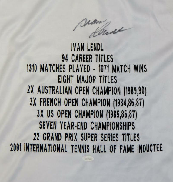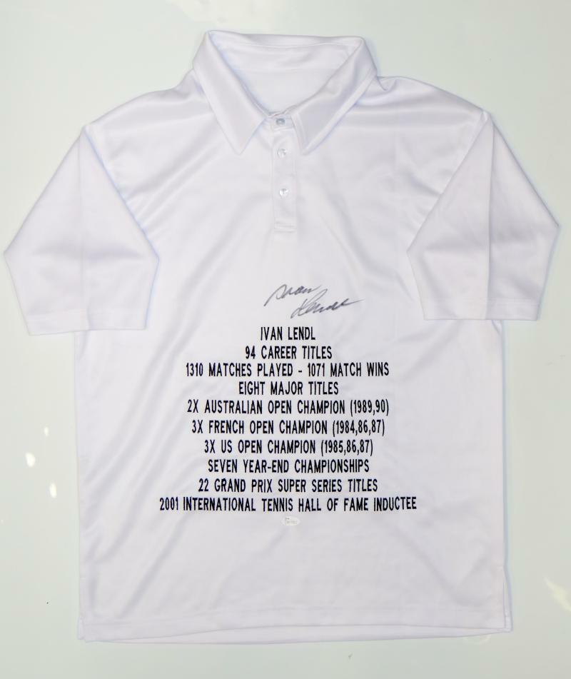 Ivan Lendl Autographed Tennis White Polo Shirt With Stats- JSA W Auth This is a Hand Autographed Polo Shirt of Ivan Lendl With Embroidered Stats. This item has a James Spence Witness Authentication, which Comes with a JSA #'ed Sticker and a Matching JSA COA. You can view this item on the SpenceLOA website and it shows when and where the item was signed. It was signed either at a public autograph appearance or a Private Signing. This is a stock photo of the item. Although you may not receive this exact item, the item you receive is virtually identical and brand new in great shape.