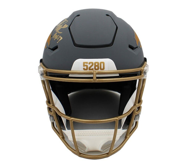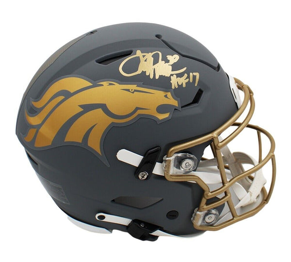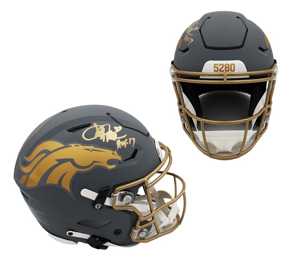A Denver Broncos Speed Flex Authentic Slate NFL Helmet hand signed by Terrell Davis. The item and signature are in excellent condition. In addition to signing the item, Terrell inscribed "HOF 17" on the item. Terrell is a former NFL running back. He was drafted 6th round in the 1995 NFL Draft by the Denver Broncos. He is 2x Super Bowl Champion, Super Bowl (XXXII) MVP, 3x Pro Bowler, 3x First-Team All-Pro, and 1998 NFL MVP. AUTHENTICATION: Your item has been tagged with a SmarTag powered by Prova Technology, which gives you digital access to your items authentication records, including a proof picture from the signing.