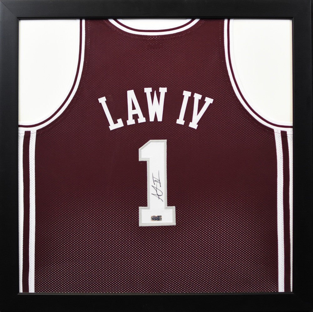 Acie Law IV, former All-American point guard for the Texas A&M Aggies, has hand signed this custom jersey at a private signing. Jersey is size XL and all letters/numbers are sewn-on. It comes professionally framed in a black wood frame. This item comes with a certificate of authenticity (COA) from Signature Sports Marketing, one of the leaders in the industry. You will receive a paper COA along with matching serial-numbered holograms.Item pictured may not be the exact item you will receive. It will be similar quality, and we guarantee your satisfaction.