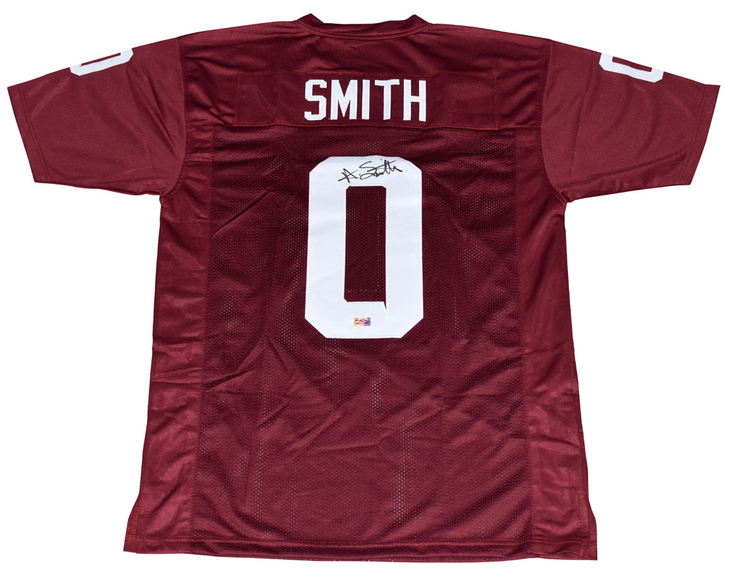 Ainias Smith, former star wide receiver for the Texas A&M Aggies, has hand signed this maroon custom jersey at a private signing. Jersey is size XL and all letters/numbers are sewn-on. This item comes with a certificate of authenticity (COA) from Signature Sports Marketing, one of the leaders in the industry. You will receive a paper COA along with matching serial-numbered holograms.Item pictured may not be the exact item you will receive. It will be similar quality, and we guarantee your satisfaction.