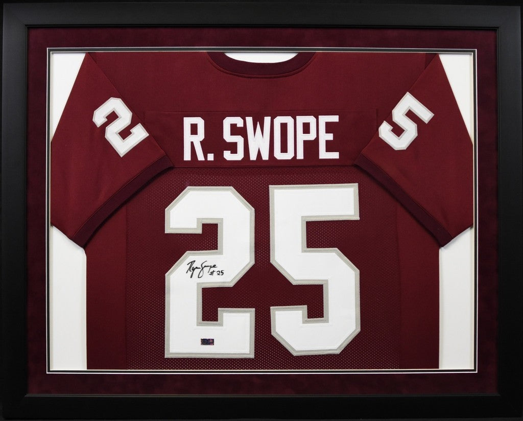 Ryan Swope, former star wide receiver for the Texas A&M Aggies, has hand signed this maroon custom jersey at a private signing. Jersey is size XL and all letters/numbers are sewn-on. It comes professionally framed in a black wood frame and double matted in Texas A&M colors. This item comes with a certificate of authenticity (COA) from Signature Sports Marketing, one of the leaders in the industry. You will receive a paper COA along with matching serial-numbered holograms.Item pictured may not be the exact item you will receive. It will be similar quality, and we guarantee your satisfaction.