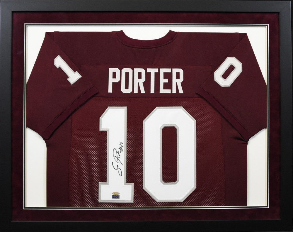 Sean Porter, former star linebacker for the Texas A&M Aggies, has hand signed this maroon custom jersey at a private signing. Jersey is size XL and all letters/numbers are sewn-on. It comes professionally framed in a black wood frame and double matted in Texas A&M colors. This item comes with a serial-numbered hologram from Tristar, one of the leaders in the industry. The authenticity can be verified online by entering the serial number. A Tristar information card is also included.Item pictured may not be the exact item you will receive. It will be similar quality, and we guarantee your satisfaction.