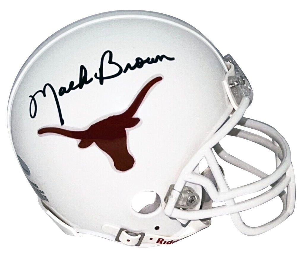 Mack Brown, former head coach of the Longhorns, has hand signed this Texas Riddell mini helmet at a private signing. This item comes with a certificate of authenticity (COA) from GT Sports Marketing, one of the leaders in the industry. You will receive a paper COA along with an official GTSM hologram on the helmet.Item pictured may not be the exact item you will receive. It will be similar quality, and we guarantee your satisfaction.