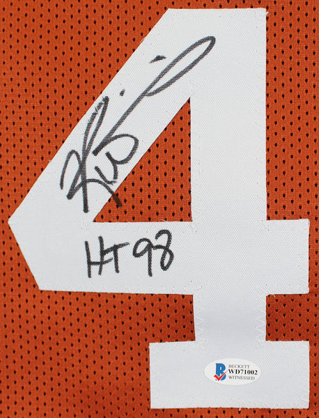 This Autographed Burnt Orange Jersey with the inscription of "98 HT (Williams), 77 HT (Campbell)" has been Personally Signed by Rickey Williams & Earl Campbell of the Texas Longhorns. This item is 100% Authentic to include a Certificate of Authenticity (COA) / hologram by Beckett Authentication Services. This is a BAS Witnessed Protection Program item which means a Beckett Authentication Service representative was present when this item was being signed. This is a stock item in which we have several available. The one you will receive will be of equal quality to the one pictured. This item can be verified through BAS Witnessed. This is a X-Large sized, non-branded, custom-stitched Jersey.