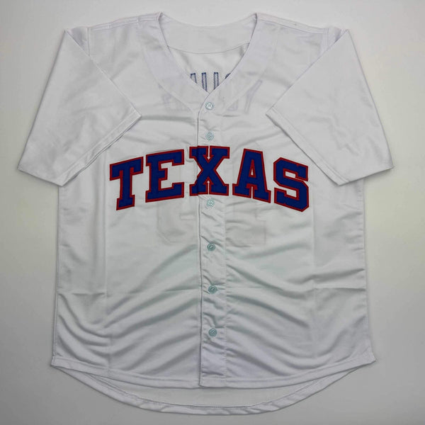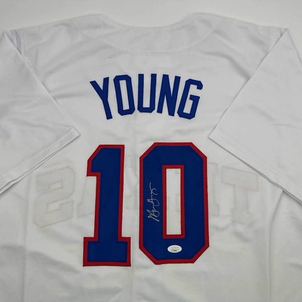 Autographed/Signed Michael Young Texas White Baseball Jersey JSA COA Jersey has no brand names or logos. This is a custom jersey and was not manufactured by or in any manner associated with any professional sports league or manufacturer. This custom jersey carries no professional sports league designation. The item is intended to be an autographed collectible. The custom jersey displays the name and number of the player. This item in no way is affiliated with or connected to any professional sports organization. Size is XL.