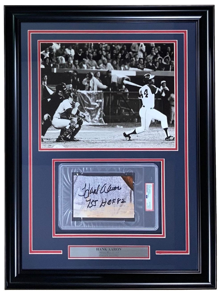 Featured is a Hank Aaron Atlanta Braves signed cut signature, inscribed "755" and "HOF 82". This cut has been hand signed by Aaron and has been authenticated and encapsulated by PSA/DNA. This cut has been professionally framed and matted and is approximately 21x30. This cut would make a great addition to any sports memorabilia collection!. SPECIFICATIONS Autographed By: Hank Aaron Team: Atlanta Braves Sport: Baseball Authentication: Professional Sports Authenticator (PSA)
