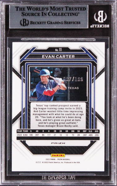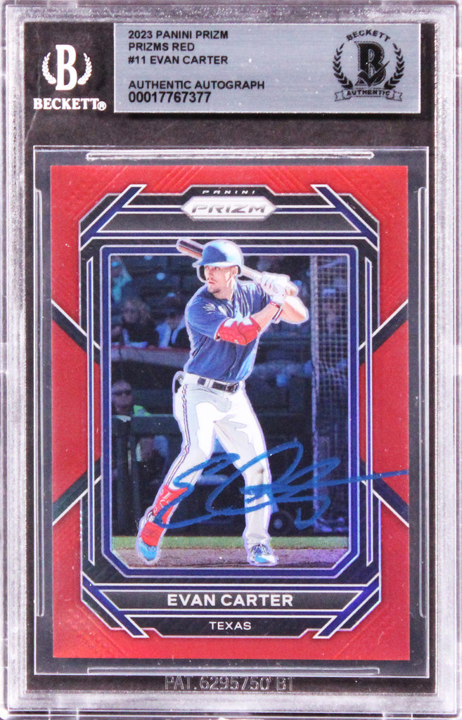 This Autographed 2023 Panini Prizm Prizms Red #11 Rookie Card has been Personally Signed by Evan Carter of the Texas Rangers. This item is 100% Authentic, it comes slabbed and authenticated by Beckett Authentication Services. The authenticity can be verified on Beckett Authentication Services website.