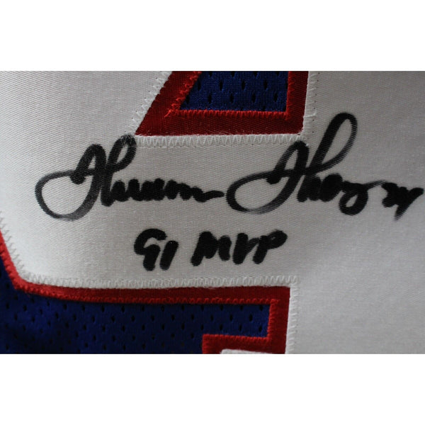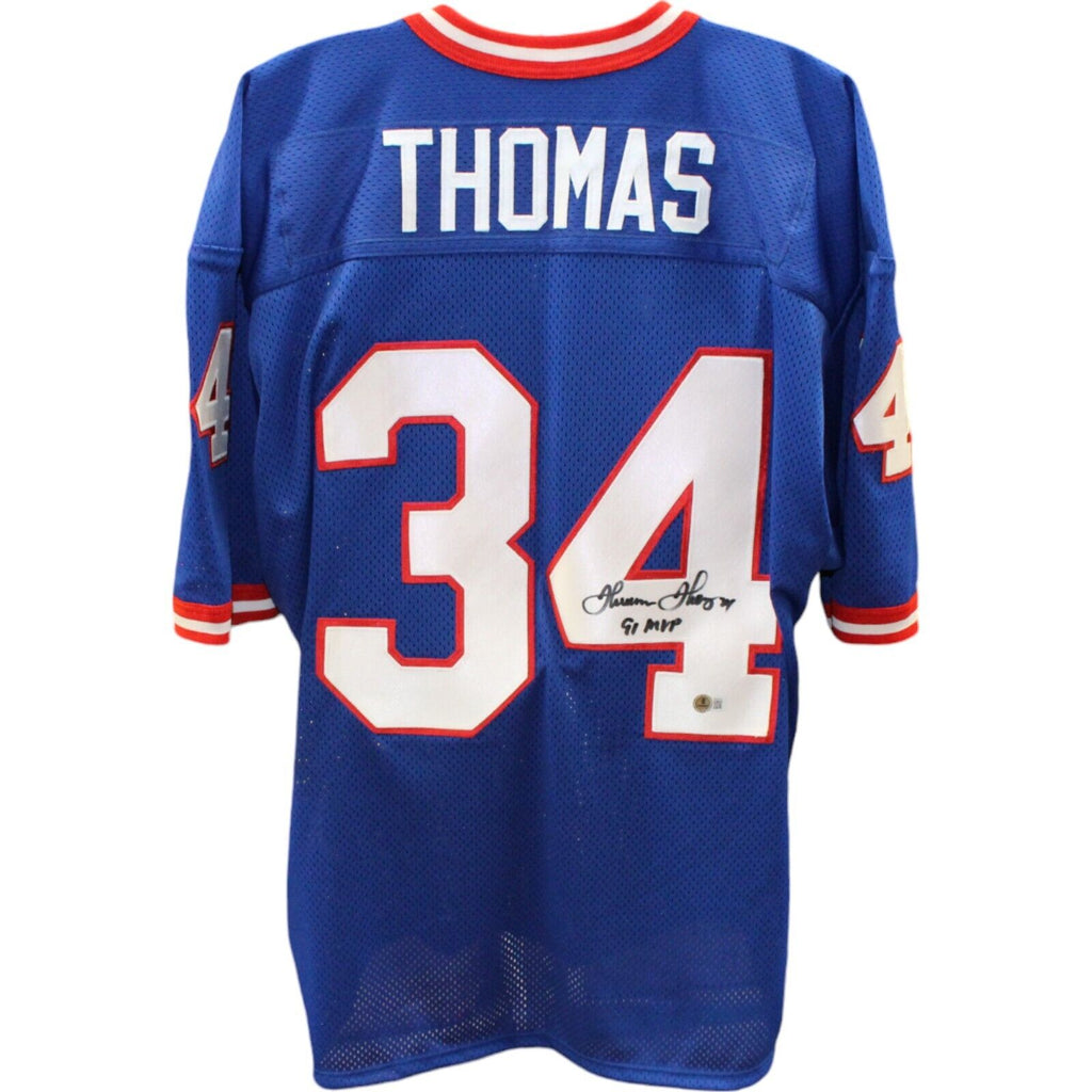 The number in the listing title is just an inventory sku for our records and is not the authentication number. The item pictured is the exact item you will receive, please see photos for condition. This is a Pro Style Blue size XL Jersey with sewn on numbers that was personally autographed by Thurman Thomas includes "91 MVP" inscription. Includes a certificate of authenticity from Beckett Authentication Services (BAS) and Denver Autographs.