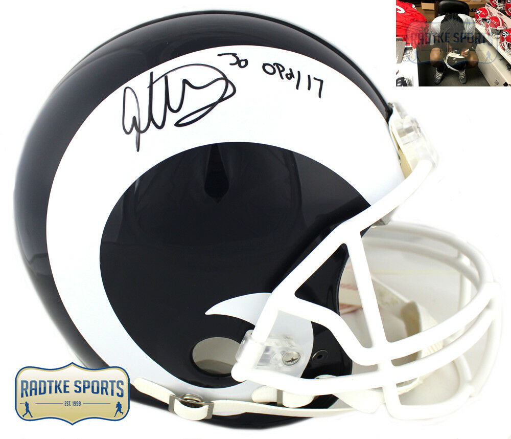 A Los Angeles Rams Riddell Authentic NFL Helmet hand signed by Todd Gurley. The item and signature are in excellent condition. In addition to signing his name Todd also inscribed "OPOY 17" on the item - Todd electrified the crowds Between the Hedges and now the NFL. Todd is a 2x Pro Bowler, First-team All-Pro, and was NFL Offensive Rookie of the Year in 2015. - AUTHENTICATION: The item is accompanied by a Certificate of Authenticity - Serial Numbered and Databased Hologram - Picture of Todd from the signing.