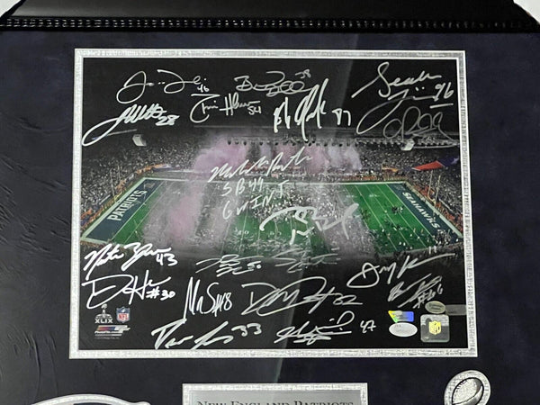 This 11x14 photograph framed to 16x20 has been personally hand signed by the New England Patriots Super Bowl XLIX Team"SB 49 GW INT" Inscription by Malcom Butler100% AuthenticCertificate of authenticity by JSA, Fanatics, New England Picture