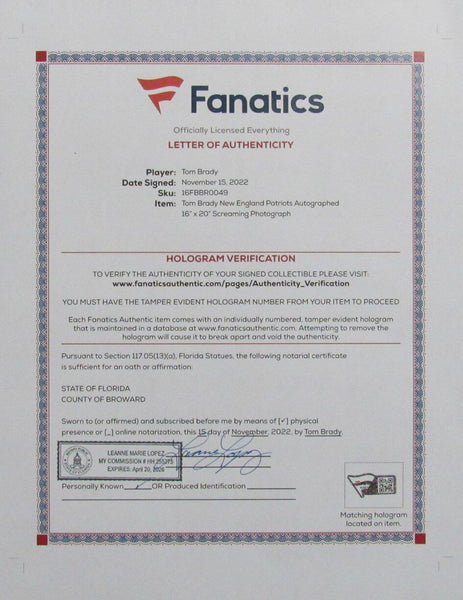 Tom Brady Autographed 16x20 Photo New England Patriots Framed. The outer frame size is 24 inches x 28 inches. This photo is authenticated by Fanatics Authentic and includes their Tamper-proof Hologram Sticker and Letter of Authenticity.
