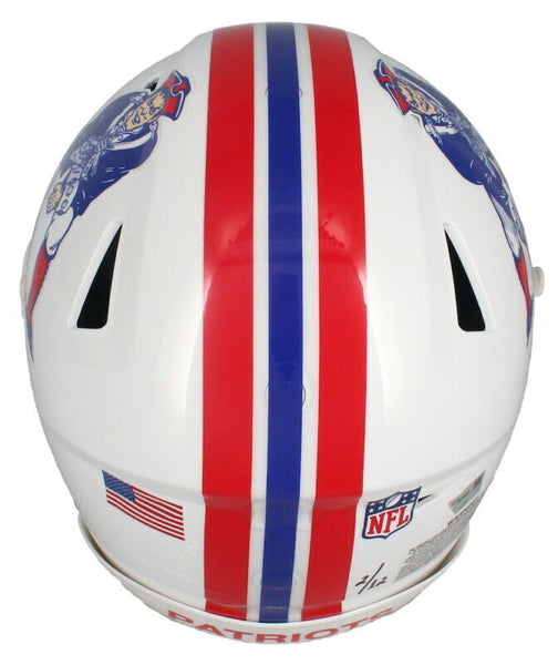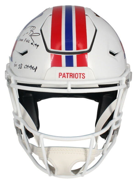 This authentic throwback speed flex helmet has been personally hand-signed by tom brady with the inscriptions "2000 pick #199" and "6x sb champ." it is officially licensed by the national football league and comes with an individually numbered, tamper-evident hologram from fanatics authentic. to ensure authenticity, the hologram can be reviewed online. this process helps to ensure that the product purchased is authentic and eliminates any possibility of duplication or fraud.this helmet is limited to 12 and you are bidding on a random number from the edition.