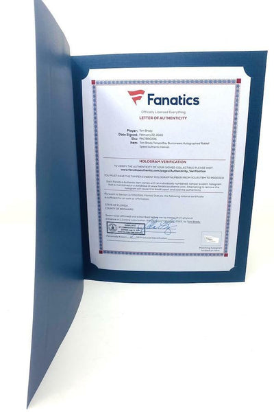 This authentic custom hall of fame visor helmet has been personally hand-signed by tom brady. it is officially licensed by the national football league and comes with an individually numbered, tamper-evident hologram from fanatics authentic. to ensure authenticity, the hologram can be reviewed online. this process helps to ensure that the product purchased is authentic and eliminates any possibility of duplication or fraud.
