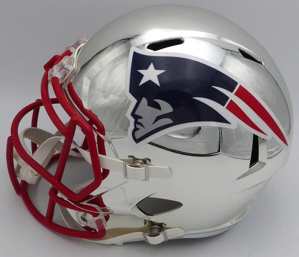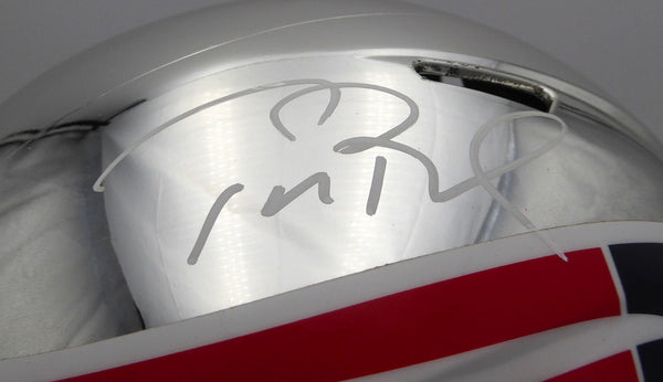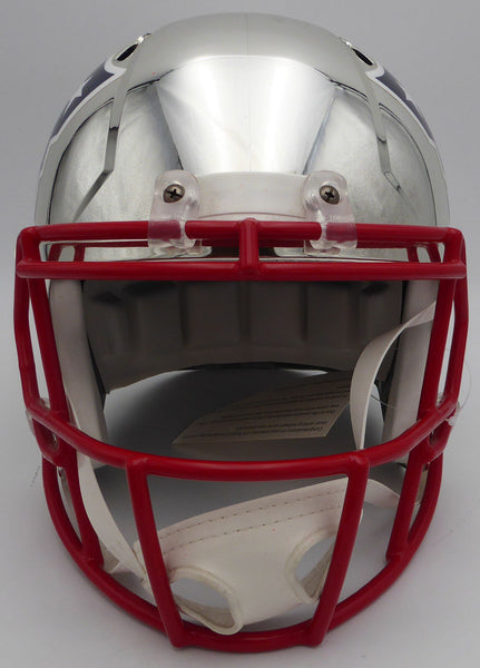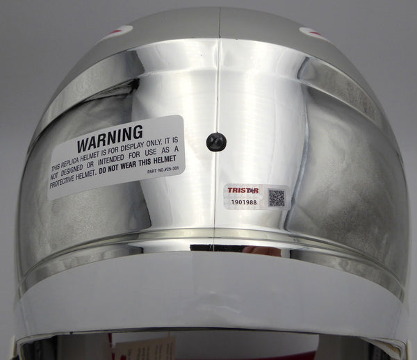 This is a Chrome Silver Full Size Replica Helmet that has been hand signed by Tom Brady. There is an imperfection in the signature as shown. This item has been certified authentic by TriStar and comes with their tamper-proof sticker and matching certificate of authenticity.
