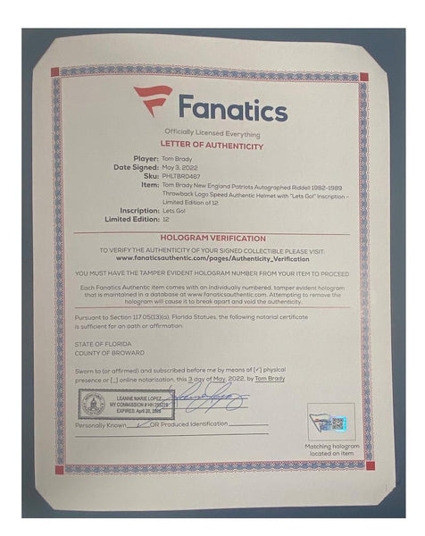 This authentic New England Patriots Throwback helmet has been personally hand-signed by Tom Brady with the inscription "Lets Go." It is officially licensed by the National Football League and comes with an individually numbered, tamper-evident hologram from Fanatics Authentic. To ensure authenticity, the hologram can be reviewed online. This process helps to ensure that the product purchased is authentic and eliminates any possibility of duplication or fraud.This helmet is limited to just 12 and the winning bidder will receive number "1" from the edition.