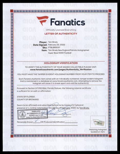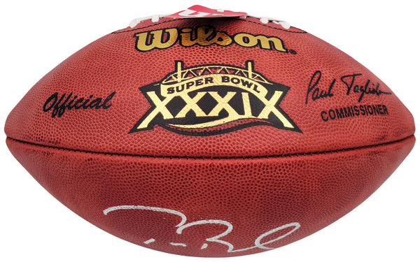 This is an Official NFL Leather Super Bowl XXXIX Logo Football that has been hand signed by Tom Brady. This item has been certified authentic by Fanatics and comes with their tamper-proof sticker and matching full-page certificate of authenticity.A A NOTE: The signature is a little smudged, as shown in the pictures.
