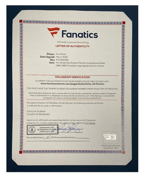 This authentic throwback speed helmet has been personally hand-signed by Tom Brady. It is officially licensed by the National Football League and comes with an individually numbered, tamper-evident hologram from Fanatics Authentic. To ensure authenticity, the hologram can be reviewed online. This process helps to ensure that the product purchased is authentic and eliminates any possibility of duplication or fraud.