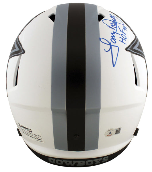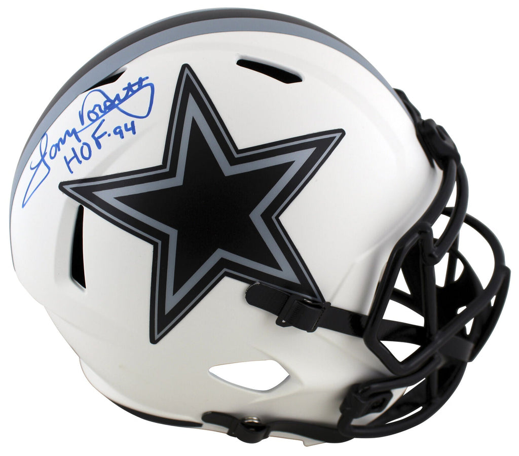 This Autographed Alternate Lunar Riddell Full Size Speed Rep Helmet with the inscription of "HOF 94" has been Personally Signed by Tony Dorsett of the Dallas Cowboys. This item is 100% Authentic to include a hologram by Beckett Authentication Services. This item will come with the new Beckett Authentication hologram that has a scannable QR code rather than the traditional COA. If you would like to have a COA, you are welcome to reach out to Beckett for a printed certification once you receive your item. This is a BAS Witnessed Protection Program item which means a Beckett Authentication Service representative was present when this item was being signed. This is a stock item. We conducted an autograph signing with Tony Dorsett and we have several of these available. The one you will receive will be of equal quality to the one pictured. This item can be verified through BAS Witnessed.