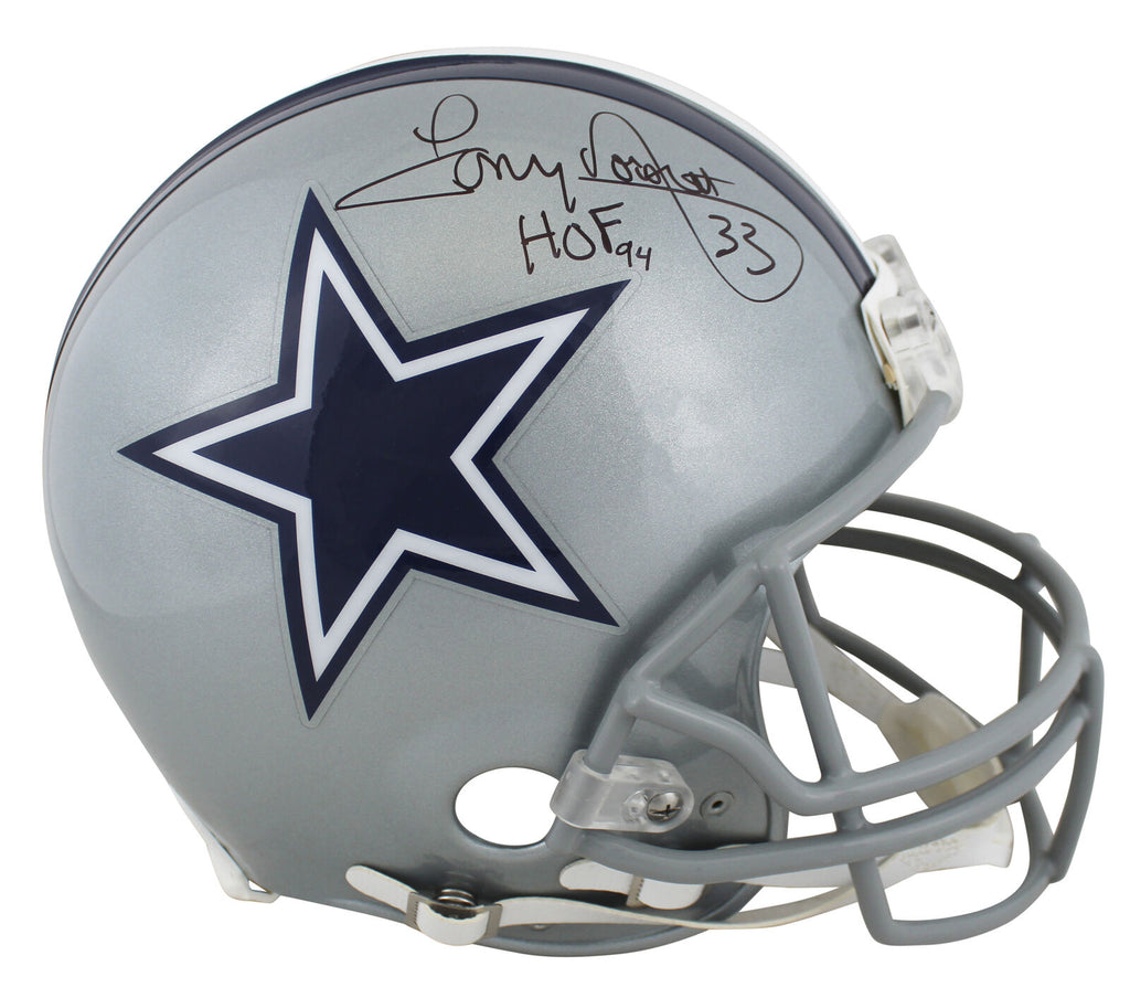This Autographed Silver Authentic Full Size Proline Helmet with the inscription of "HOF 94" has been Personally Signed by Tony Dorsett of the Dallas Cowboys. This item is 100% Authentic to include a Certificate of Authenticity (COA) / hologram by Beckett Authentication Services. This is a BAS Witnessed Protection Program item which means a Beckett Authentication Service representative was present when this item was being signed. This is a stock item. We conducted an autograph signing with Tony Dorsett and we have several of these available. The one you will receive will be of equal quality to the one pictured. This item can be verified through BAS Witnessed.