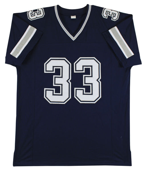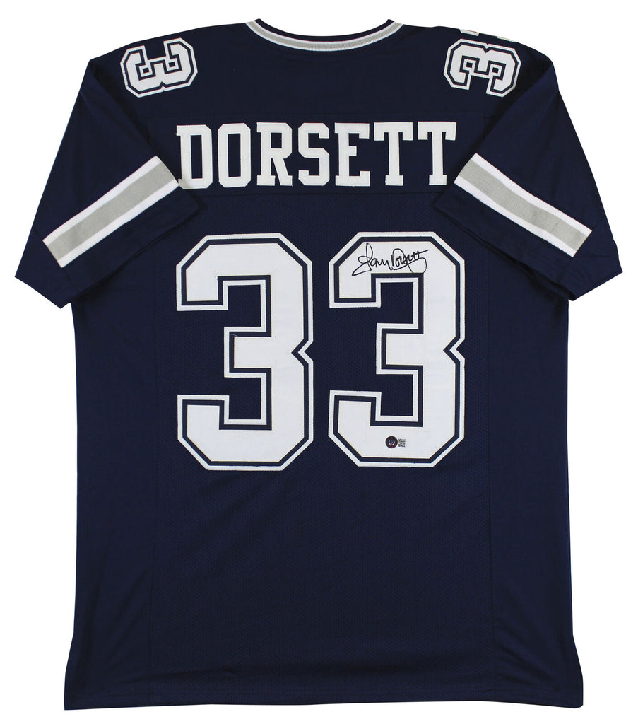 This Autographed Navy Blue Jersey has been Personally Signed by Tony Dorsett of the Dallas Cowboys. This item is 100% Authentic to include a hologram by Beckett Authentication Services. This item may come with the new Beckett Authentication hologram that has a scannable QR code rather than the traditional COA. If you would like to have a COA, you are welcome to reach out to Beckett for a printed certification once you receive your item. This is a BAS Witnessed Protection Program item which means a Beckett Authentication Service representative was present when this item was being signed. This is a stock item. We conducted an autograph signing with Tony Dorsett and we have several of these available. The one you will receive will be of equal quality to the one pictured. This item can be verified through BAS Witnessed. This is a X-Large sized, non-branded, custom-stitched Jersey. We only offers Authentic Autographs by Tony Dorsett through Signings, In-Person Signings or Private Collections to include a 100% money back Lifetime Authenticity Guarantee.