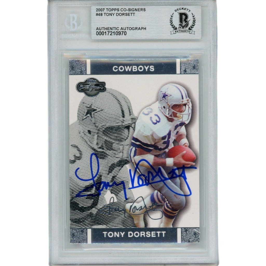 The number in the listing title is just an inventory sku for our records and is not the authentication number. The item pictured is the exact item you will receive, please see photos for condition. This is a Dallas Cowboys 2007 Topps Co-Signers 48 Slabbed Trading Card that was personally autographed by Tony Dorsett. Includes a certificate of authenticity from Beckett Authentication Services (BAS) and Denver Autographs.FREE SHIPPING within the USA on orders over $10!