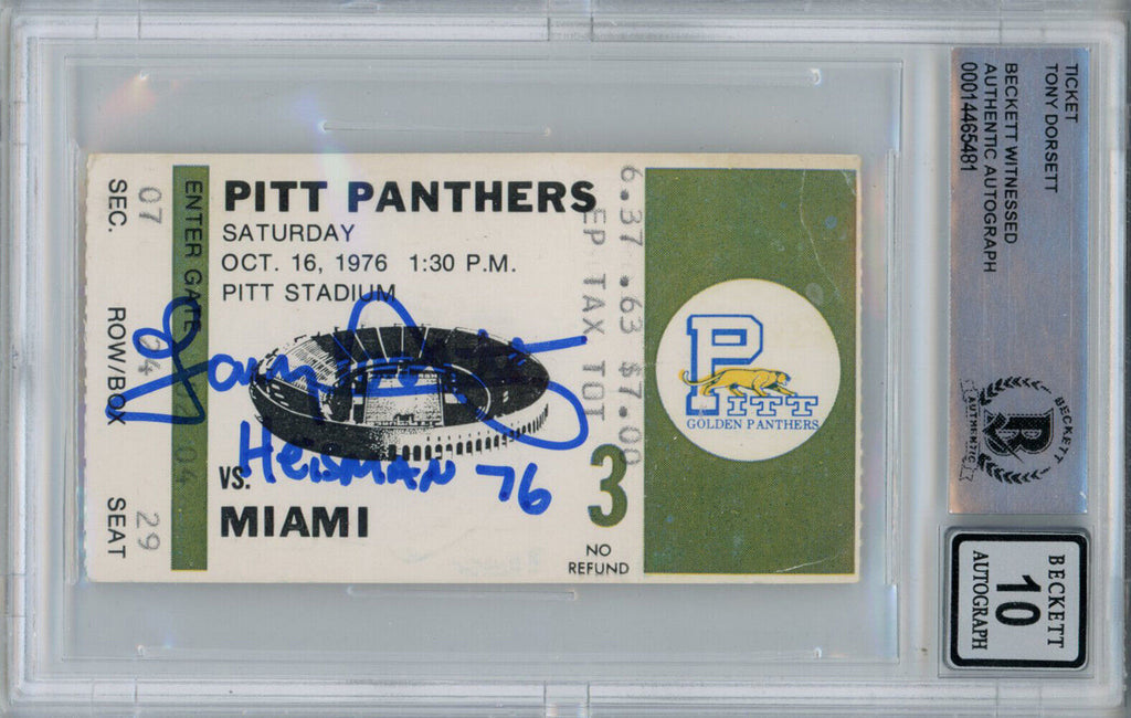 Tony Dorsett Autographed 10/16/1976 Ticket Stub Heisman Beckett Slab 34028 The number in the listing title is just an inventory sku for our records and is not the authentication number. This is the exact item that you will receive so please see pictures for condition. This is a Pittsburgh Panthers vs Miami ticket stub that was personally autographed by Tony Dorsett with Heisman inscription. This has been professionally slabbed by Beckett Authentication Services (BAS) and includes a certificate of authenticity from Denver Autographs.