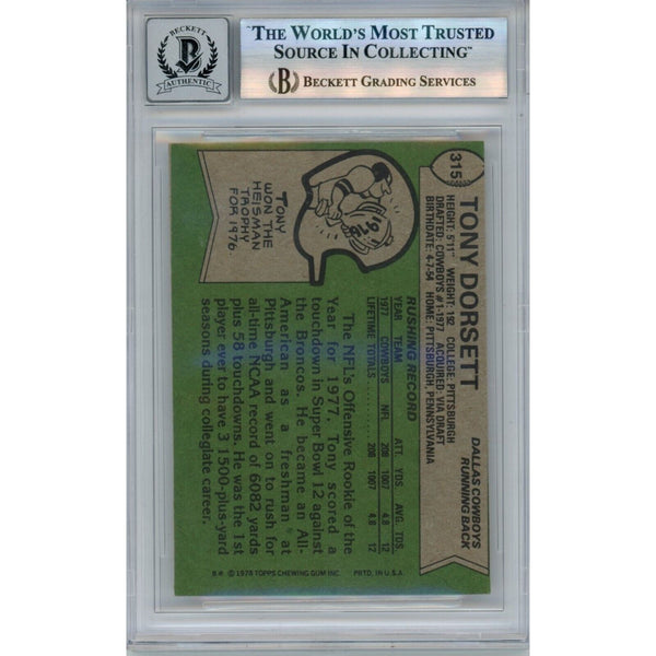 The number in the listing title is just an inventory sku for our records and is not the authentication number. The item pictured is the exact item you will receive, please see photos for condition. This is a 1978 Topps #315 with a grade 10 auto Slabbed Trading Card that was personally autographed by Tony Dorsett with "HOF" inscription. Includes a certificate of authenticity from Beckett Authentication Services (BAS) and Denver Autographs.FREE SHIPPING within the USA on orders over $10!