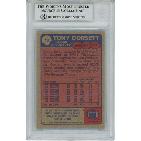 The number in the listing title is just an inventory sku for our records and is not the authentication number. The item pictured is the exact item you will receive, please see photos for condition. This is a Dallas Cowboys 1985 Topps 40 Slabbed Trading Card that was personally autographed by Tony Dorsett. Includes a certificate of authenticity from Beckett Authentication Services (BAS) and Denver Autographs.FREE SHIPPING within the USA on orders over $10!
