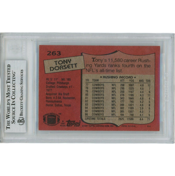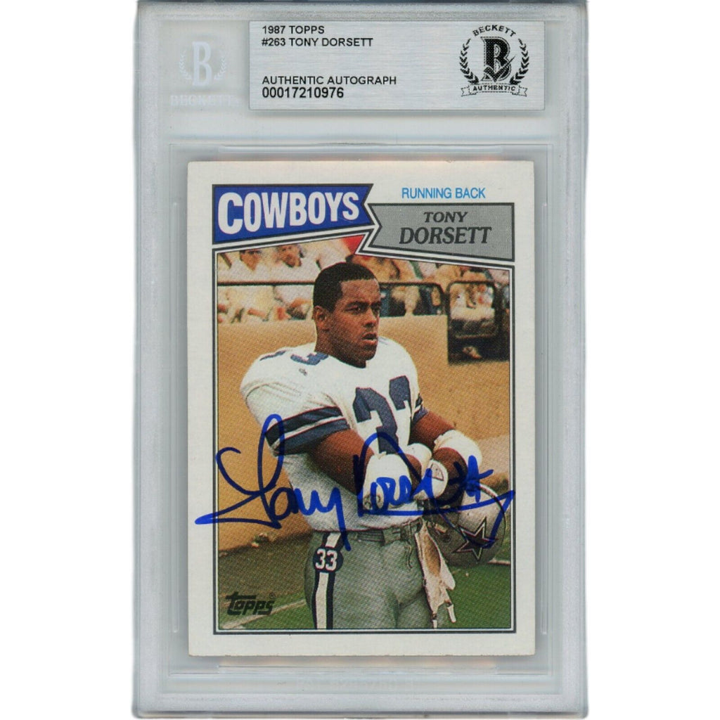 The number in the listing title is just an inventory sku for our records and is not the authentication number. The item pictured is the exact item you will receive, please see photos for condition. This is a Dallas Cowboys 1987 Topps 263 Slabbed Trading Card that was personally autographed by Tony Dorsett. Includes a certificate of authenticity from Beckett Authentication Services (BAS) and Denver Autographs.FREE SHIPPING within the USA on orders over $10!