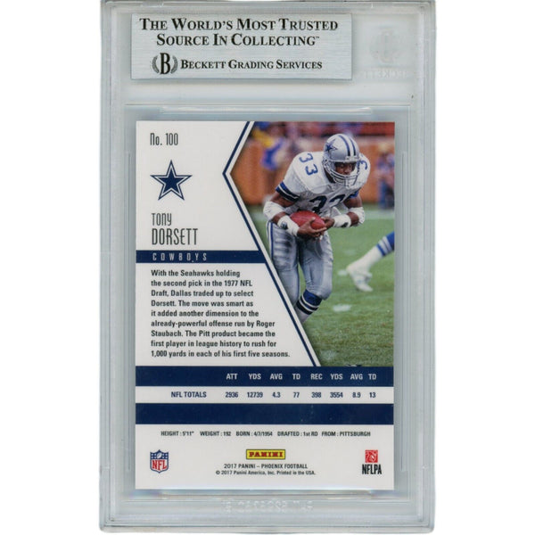 The number in the listing title is just an inventory sku for our records and is not the authentication number. The item pictured is a stock photo unless otherwise noted. This is a Dallas Cowboys 2017 Phoenix 100 Slabbed Trading Card that was personally autographed by Tony Dorsett. Includes a certificate of authenticity from Beckett Authentication Services (BAS) and Denver Autographs.FREE SHIPPING within the USA on orders over $10!