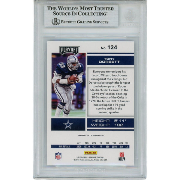 The number in the listing title is just an inventory sku for our records and is not the authentication number. The item pictured is a stock photo unless otherwise noted. This is a Dallas Cowboys 2017 Playoff 124 Slabbed Trading Card that was personally autographed by Tony Dorsett. Includes a certificate of authenticity from Beckett Authentication Services (BAS) and Denver Autographs.FREE SHIPPING within the USA on orders over $10!