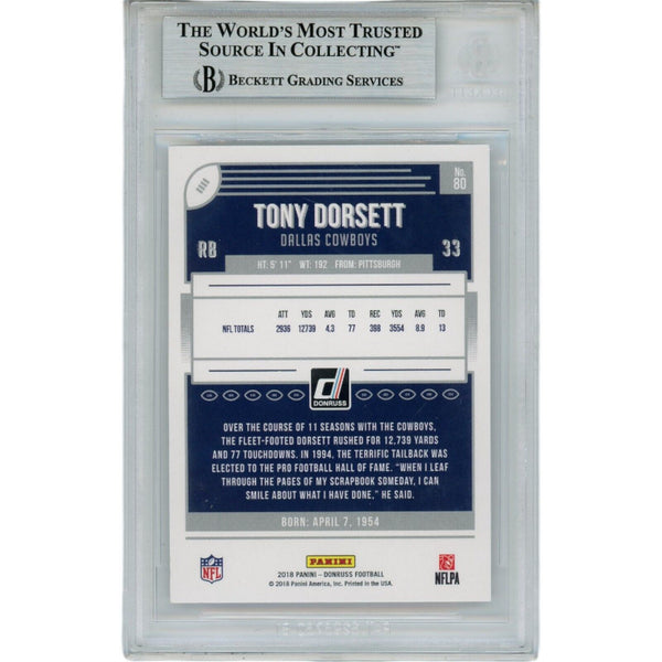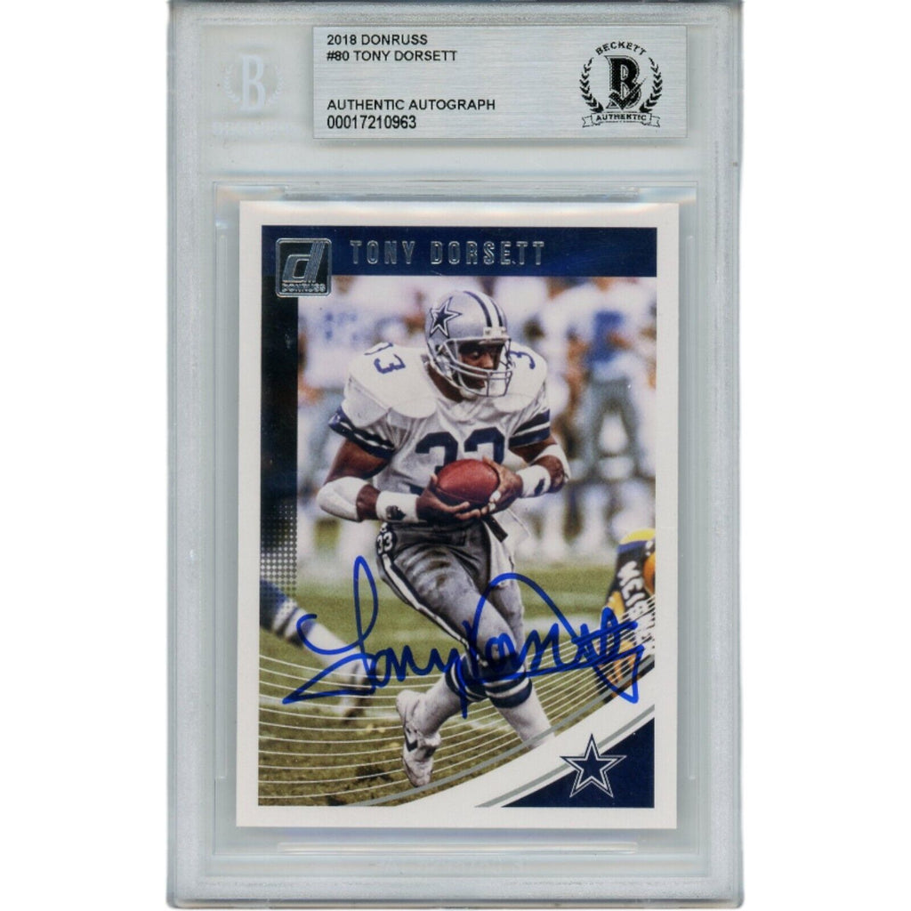 The number in the listing title is just an inventory sku for our records and is not the authentication number. The item pictured is a stock photo unless otherwise noted. This is a Dallas Cowboys 2018 Donruss 80 Slabbed Trading Card that was personally autographed by Tony Dorsett. Includes a certificate of authenticity from Beckett Authentication Services (BAS) and Denver Autographs.FREE SHIPPING within the USA on orders over $10!