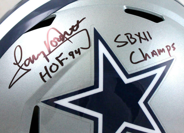 Tony Dorsett Autographed Dallas Cowboys F/S Speed Helmet w/2 Insc.-Beckett W Hologram This is a Hand Autograph of Tony Dorsett of the Dallas Cowboys on a Riddell Football Full Size Replica Speed Helmet and inscribed with HOF 94 and SB Champs. This item has a Beckett Witness Authentication, which comes with a Beckett numbered hologram and a QR code for verification. You can view this item on the Beckett Authentication website, it shows when and where the item was signed. It was signed either at a public autograph appearance or a private signing. This is a stock photo of the item. Although you may not receive this exact item, the item you receive is virtually identical and brand new in great shape.