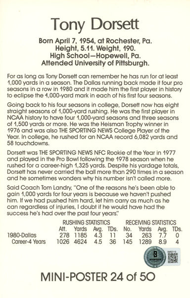 Tony Dorsett Autographed Dallas Cowboys Mini Poster 24/50 Beckett 46102