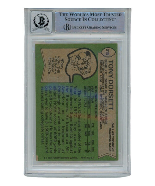 Tony Dorsett Autographed/Signed 1978 Topps #315 Trading Card Beckett 39411 The number in the listing title is just an inventory sku for our records and is not the authentication number. This is a 1978 Topps #315 trading card that was personally autographed by Tony Dorsett. This was professionally authenticated and slabbed by Beckett Authentication Services (BAS), also includes a certificate of authenticity from Denver Autographs.