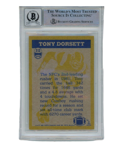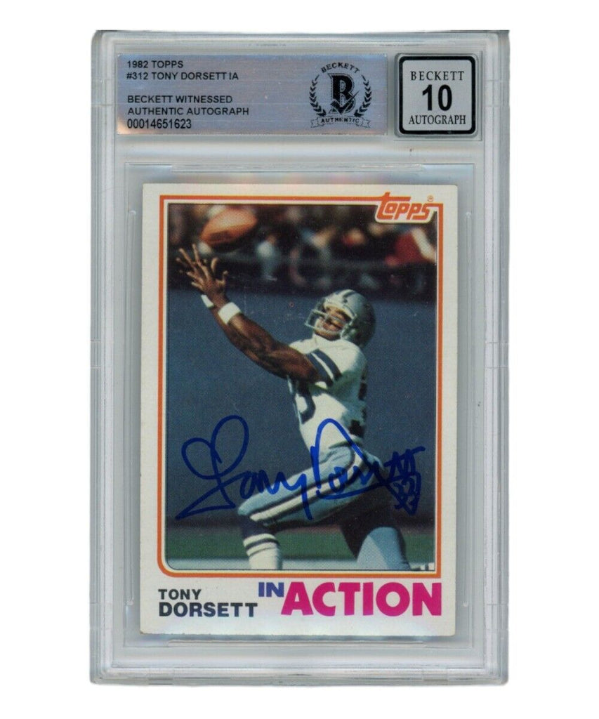 Tony Dorsett Autographed/Signed 1982 Topps Action #312 Beckett 39433 The number in the listing title is just an inventory sku for our records and is not the authentication number. This is a 1982 Topps #312 trading card that was personally autographed by Tony Dorsett. This was professionally authenticated and slabbed by Beckett Authentication Services (BAS), also includes a certificate of authenticity from Denver Autographs.
