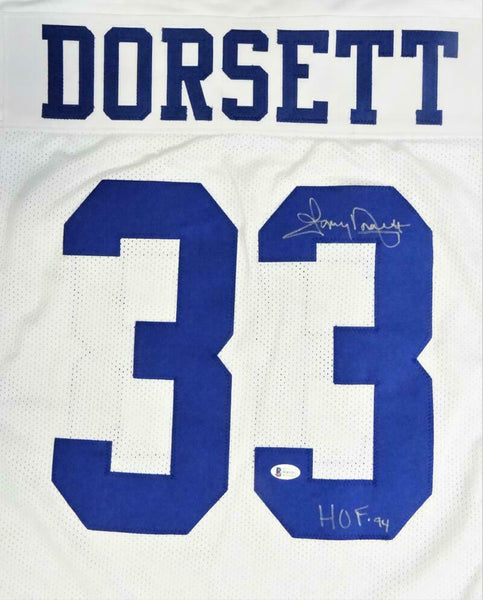 THIS IS NOT AN NFL JERSEY. THIS HAS NO TAGS, NO LOGOS, NO EMBLEMS. This is a hand autograph of Tony Dorsett on a Custom Made (non-name brand) authentic style jersey with stitched letters and numbers. This item has a Beckett Witnessed Authentication, which comes with a numbered and a matching Beckett Certificate of Authenticity. You can view this item on the Beckett Authentication website, it shows when and where the item was signed. It was signed either at a public autograph appearance or a private signing. This is a stock photo of the item. Although you may not receive this exact item, the item you receive is virtually identical and brand new in great shape. Jersey size is XL. THIS IS NOT AN NFL JERSEY. THIS HAS NO TAGS, NO LOGOS, NO EMBLEMS. This is a hand autograph of Tony Dorsett on a Custom Made (non-name brand) authentic style jersey with stitched letters and numbers. This item has a Beckett Witnessed Authentication, which comes with a numbered and a matching Beckett Certificate of Authenticity. You can view this item on the Beckett Authentication website, it shows when and where the item was signed. It was signed either at a public autograph appearance or a private signing. This is a stock photo of the item. Although you may not receive this exact item, the item you receive is virtually identical and brand new in great shape. Jersey size is XL.