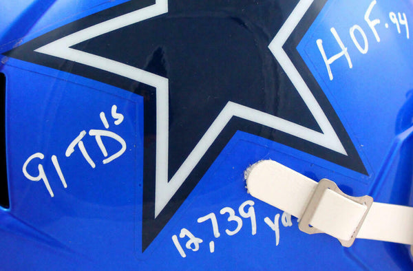 Tony Dorsett Autographed Dallas Cowboys F/S Flash Speed Helmet w/5 Stats-Beckett W Hologram *White This is a hand autograph of Tony Dorsett of the Dallas Cowboys on a Riddell Football Full Size Flash Speed Replica Helmet. Inscribed with ROY, SB Champs, 91 tds, 12,739 yds, HOF. This item has a Beckett Witnessed Authentication, which comes with a numbered hologram and a QR code for verification. You can view this item on the Beckett Authentication website and it shows when and where the item was signed. It was signed either at a public autograph appearance or a private signing. This is a stock photo of the item. Although you may not receive this exact item, the item you receive is virtually identical and brand new in great shape.