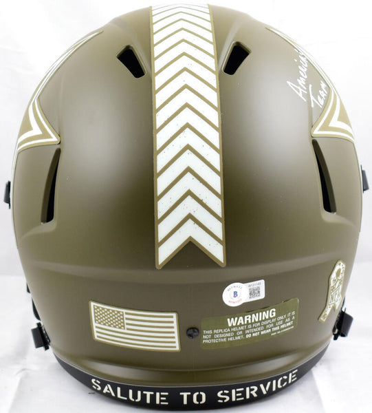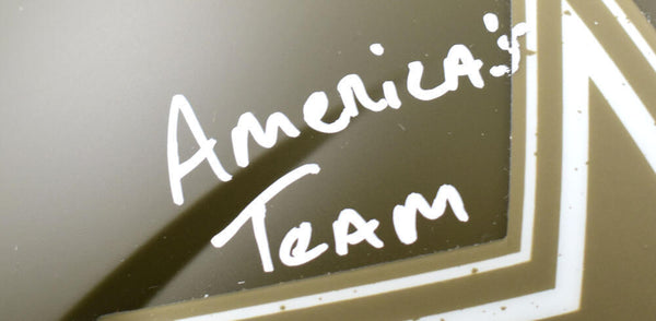 Tony Dorsett Autographed Dallas Cowboys F/S Salute to Service Speed Helmet w/America's Team-Beckett W Hologram *White This is a hand autograph of Tony Dorsett of the Dallas Cowboys on a Riddell Football Full Size Salute to Service Speed Replica Helmet. This item is inscribed with America's Team. This item has a Beckett Witnessed Authentication, which comes with a numbered and a QR code for verification. You can view this item on the Beckett Authentication website and it shows when and where the item was signed. It was signed either at a public autograph appearance or a private signing. This is a stock photo of the item. Although you may not receive this exact item, the item you receive is virtually identical and brand new in great shape.