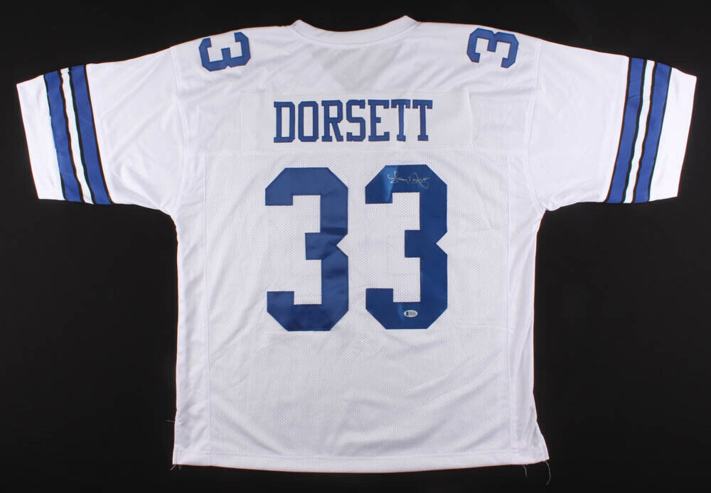 Custom on-field style jersey. Everything sewn on, size XL. Hand-signed in silver felt-tip pen by Tony Dorsett (HOF). The lot / autograph(s) includes an official Beckett Authentication Services serially numbered hologram for authenticity purposes. The signing of this item was witnessed by Beckett.Authentication: Beckett Hologram