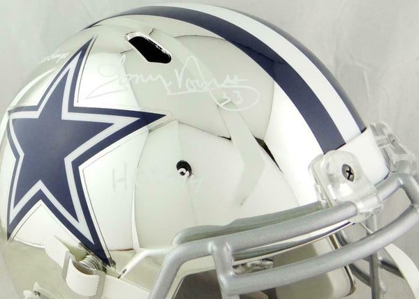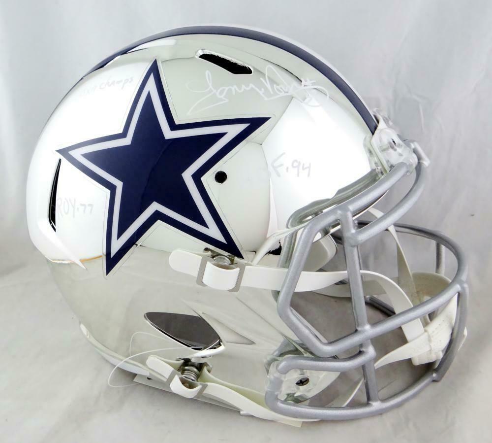 Tony Dorsett Autographed Dallas Cowboys F/S Chrome Speed Helmet w/3 Insc- Beckett Auth *White This is a hand autograph of Tony Dorsett of the Dallas Cowboys on a Riddell Football Full Size Chrome Speed Replica Helmet. This item has a Beckett Witness Authentication, which comes with a Beckett numbered sticker and a matching Certificate of Authenticity. You can view this item on the Beckett website, it shows when and where the item was signed. It was signed either at a public autograph appearance or a private signing. This is a stock photo of the item. Although you may not receive this exact item, the item you receive is virtually identical and brand new in great shape.