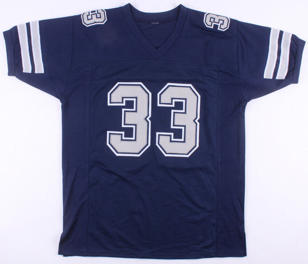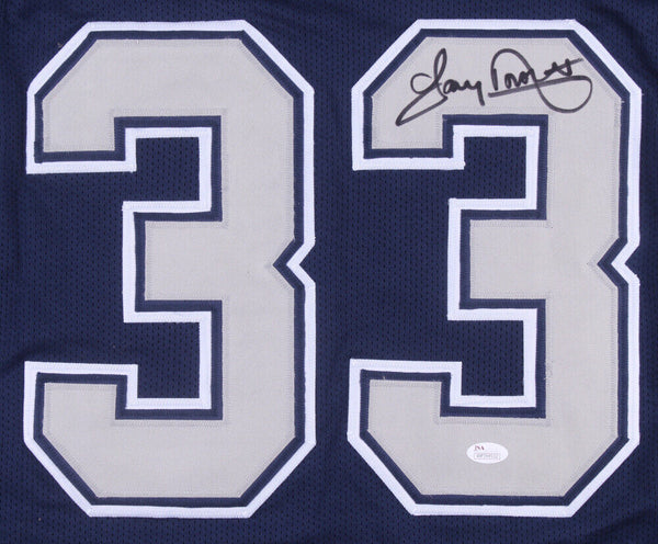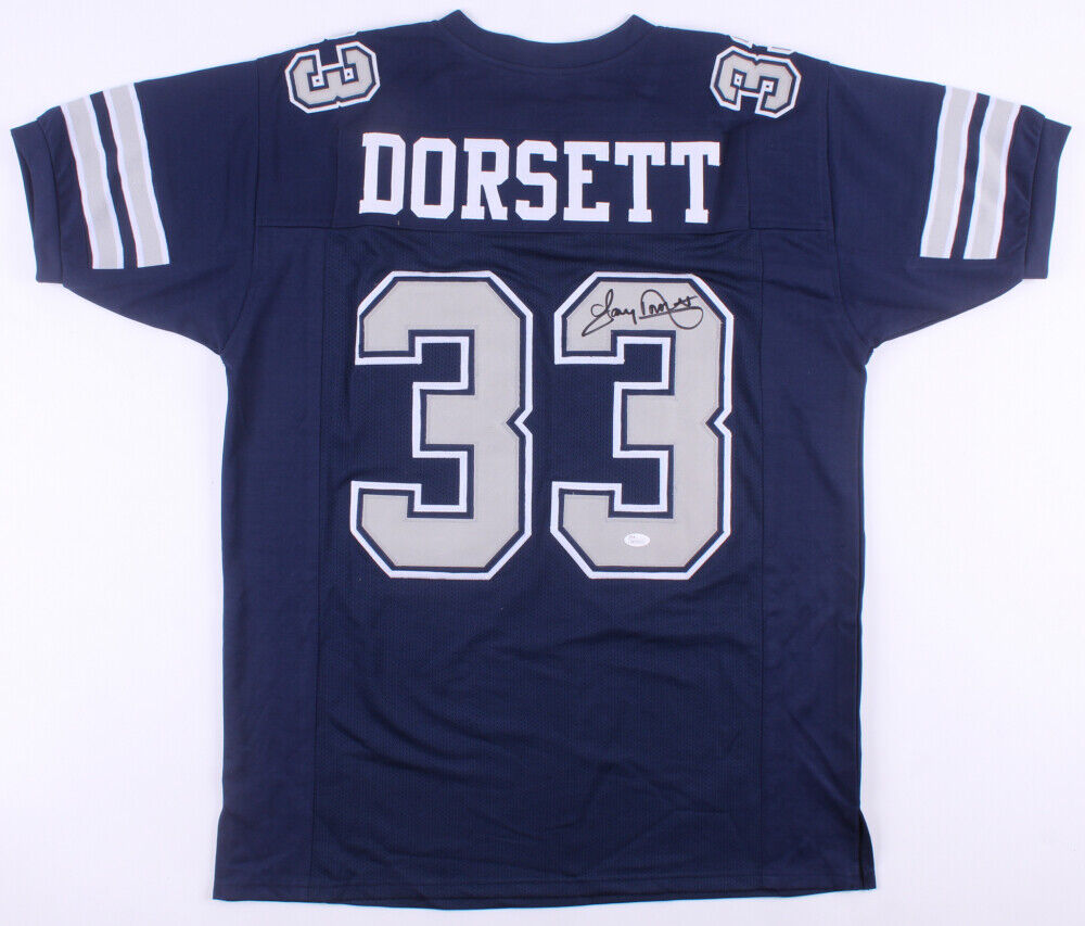 Custom on-field style jersey. Everything is sewn on, size XL. Hand-signed in black felt-tip pen by Tony Dorsett (HOF). The lot / autograph(s) includes an official James Spence Authentication (JSA) hologram for authenticity purposes. The signing of this item was witnessed by JSA.Authentication: JSA Hologram