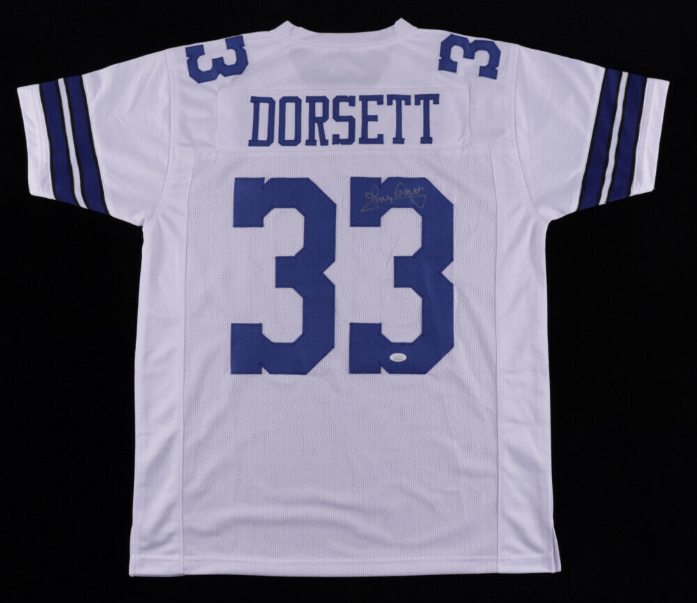 Custom on-field style jersey. Everything is sewn on, size XL. Hand-signed in silver paint pen by Tony Dorsett (HOF). The lot / autograph(s) includes an official James Spence Authentication (JSA) hologram and matching COA for authenticity purposes. The signing of this item was witnessed by JSA.Authentication: JSA COA