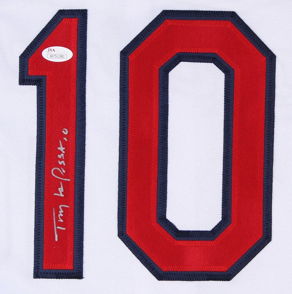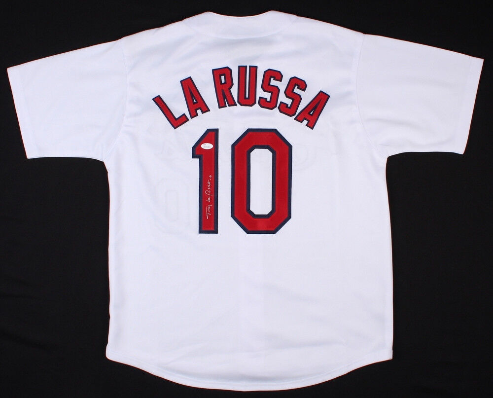 Custom on-field style jersey. Everything is sewn on, size XL. Hand-signed in silver paint pen by Tony La Russa (HOF). The lot / autograph(s) includes an official James Spence Authentication (JSA) hologram and matching COA for authenticity purposes. The signing of this item was witnessed by JSA.Authentication: JSA COA