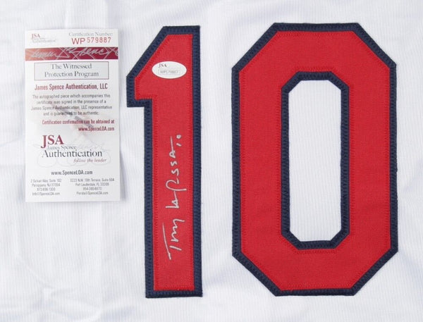 Custom on-field style jersey. Everything is sewn on, size XL. Hand-signed in silver paint pen by Tony La Russa (HOF). The lot / autograph(s) includes an official James Spence Authentication (JSA) hologram and matching COA for authenticity purposes. The signing of this item was witnessed by JSA.Authentication: JSA COA