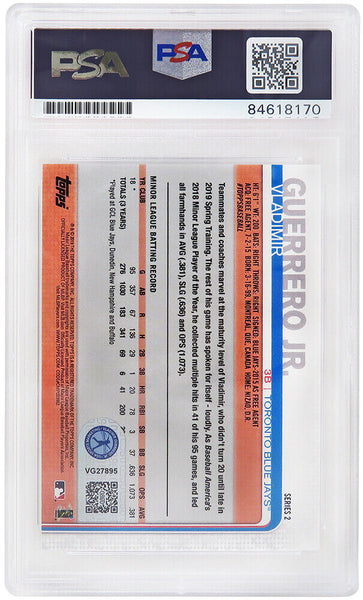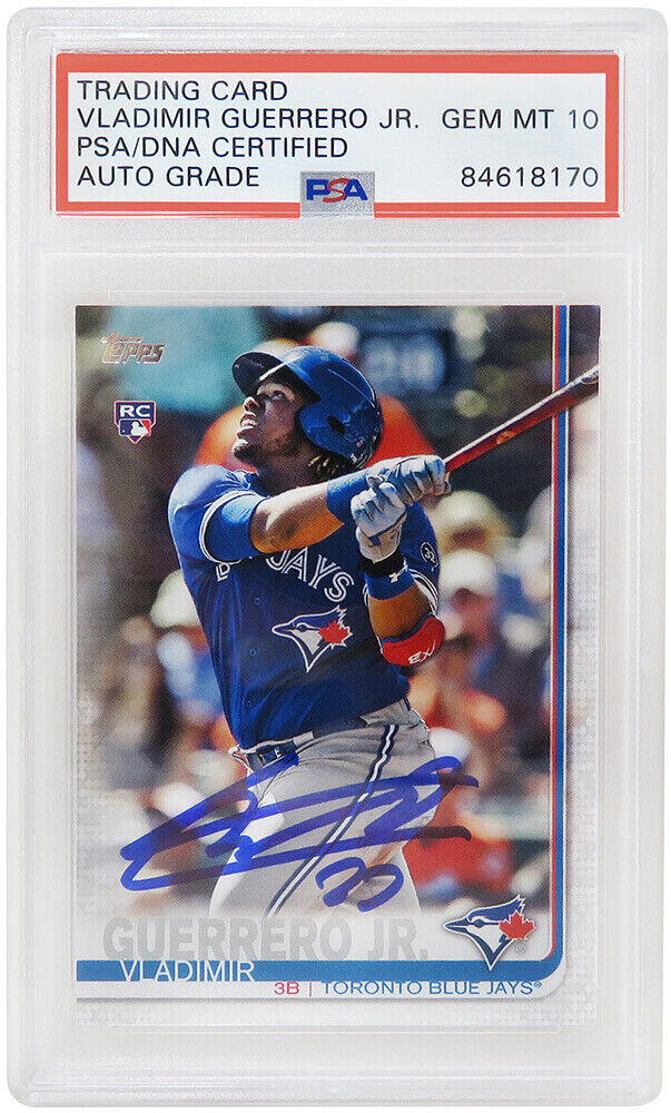 Vladimir Guerrero Jr signed Toronto Blue Jays 2019 Topps Series 2 rookie baseball trading card (no number). Item comes with a Vladimir Guerrero Jr personal hologram (on back of physical card) and has been authenticated and encapsulated by PSA and the autograph has been given a GEM Mint 10 auto grade. The authentication number can be verified online. Only the autograph has been graded a 10 by PSA, the card itself is ungraded. The image of the item is a stock photo, as we may have multiples of the item in stock. The Slabbed Card you will receive will be of the card described. (Same grade, Same authentication) You may or may not receive the exact PSA serial number on the slab label shown in image.