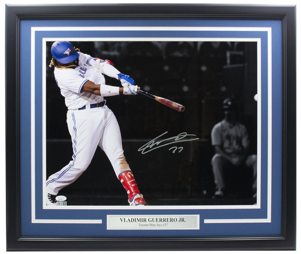 Featured is a Vladimir Guerrero Jr. signed framed 16x20 Toronto Blue Jays baseball photo. This photo was hand signed by Vladimir Guerrero Jr and authenticated by JSA authentication services. Included with the frame is a JSA hologram and certificate of authentication. This item would make a great addition to any sports memorabilia collection. SPECIFICATIONS Autographed By: Vladimir Guerrero Jr Team: Toronto Blue Jays Sport: Baseball Authentication: James Spence Authentication (JSA)